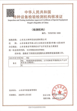 山東光大特種設(shè)備檢測有限公司是經(jīng)山東省市場監(jiān)督管理局核準(zhǔn)的甲類B1特種設(shè)備綜合檢驗機構(gòu)。2017年9月30日取得了山東省市場監(jiān)督管理局頒發(fā)的《檢驗檢測機構(gòu)資質(zhì)認(rèn)定證書》。2018年2月22日取得了山東省市場監(jiān)督管理局頒發(fā)的《特種設(shè)備檢驗檢測機構(gòu)核準(zhǔn)證》(起重機械)檢驗檢測資質(zhì)。2021年11月取得山東省市場監(jiān)督管理局版發(fā)的《特種設(shè)備檢驗檢測機構(gòu)核準(zhǔn)證》(安全閥在線、離線)校驗資質(zhì)。2023年11月取得山東省市場監(jiān)督管理局頒發(fā)的甲類檢驗機構(gòu)B1《特種設(shè)備檢驗檢測機構(gòu)核準(zhǔn)證》,具有壓力容器(RD2...